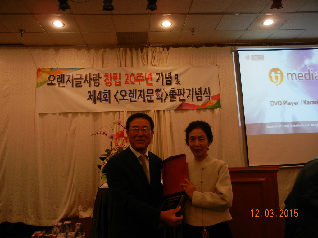 감사패를 증정하는 정 찬열 회장.새 신인 수필가, 행복한 이영미.
