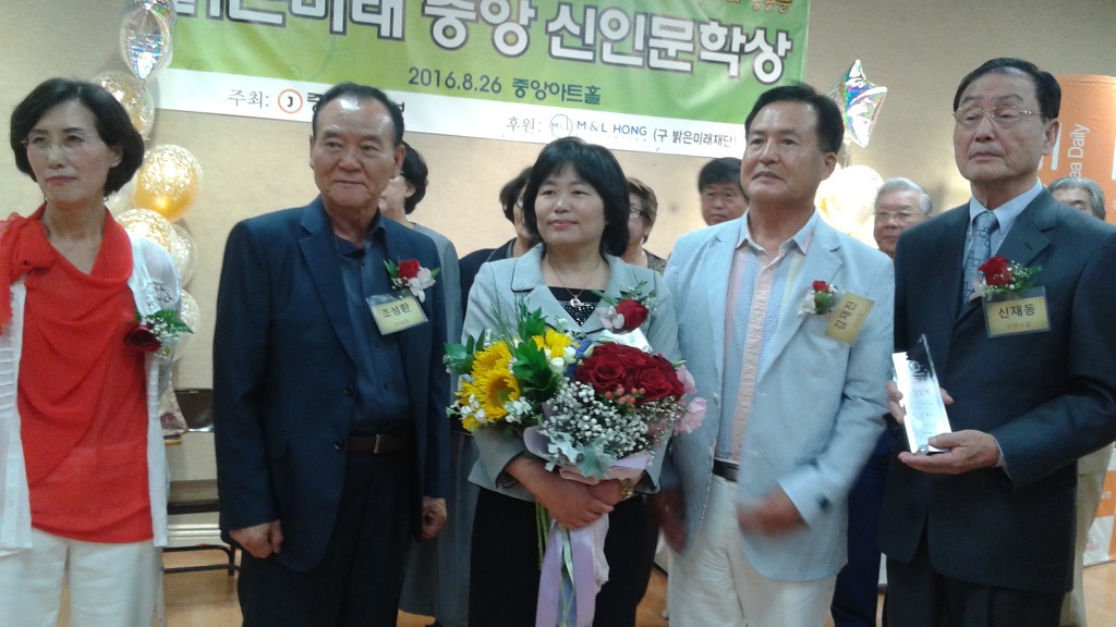 왼쪽부터수 넌 픽숀 최우수작 "하얀 파도 꽃"의 홍 용희 씨, 시조부문 가작"민들레 촌" 의 조성환 씨, 수필 최 우수상"10월 풍경"의 박영실 씨. 시 우수작"밀물"의 김 재진 씨. 소설 부문 최 우수상"작은 멋쟁이 나비" 의 신 재동 씨