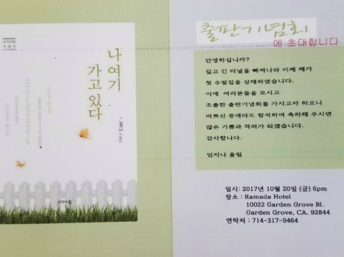 임 지나 수필집 "나 여기 가고 있다" 출판기념회 작성자snowwhite|작성시간17.10.17|조회수22 목록 댓글 0 글자크기 작게가 글자크기 크게가 다음검색 현재 게시글 추가 기능 열기 북마크 공유하기 신고 센터로 신고 댓글 댓글 0 댓글쓰기 답글쓰기 댓글 리스트