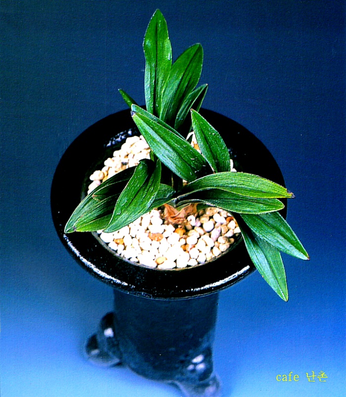 한국춘란 단엽종 가림으로 곤봉상의 엽형과 짙은 취색의 엽색과 짧은 엽장에 비해 엽폭이 넓은 광엽에 두터운 후육의 잎으로 나사양