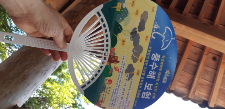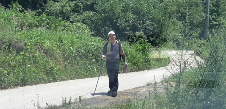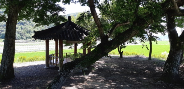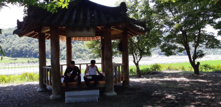 큰길로 나와 마을 정자 더위 쉼터에서 일단 더위를 식히고 숨돌리고 가자고 쉼터로 가서 선풍기가 있길래 틀어 놓고