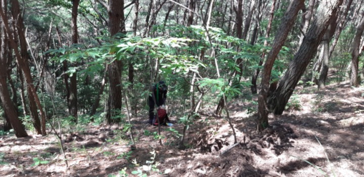 입산하여 3명이 각자 다른 방향으로 돌격 앞으로 하여 탐란에 든다 아무리 보아도 난초 생강근은 없고 어느님인지 벌써 와서 다 헤치고 지나 갔고 생강근 몇포기 뽑아 놓고 가버렸다. 님들이 헤쳐 놓아 뿌리가 들어 난 난초가 있어 덮어 주려고 살펴 보니 작년촉에 산반 끼가 있어 보여 체포 한다