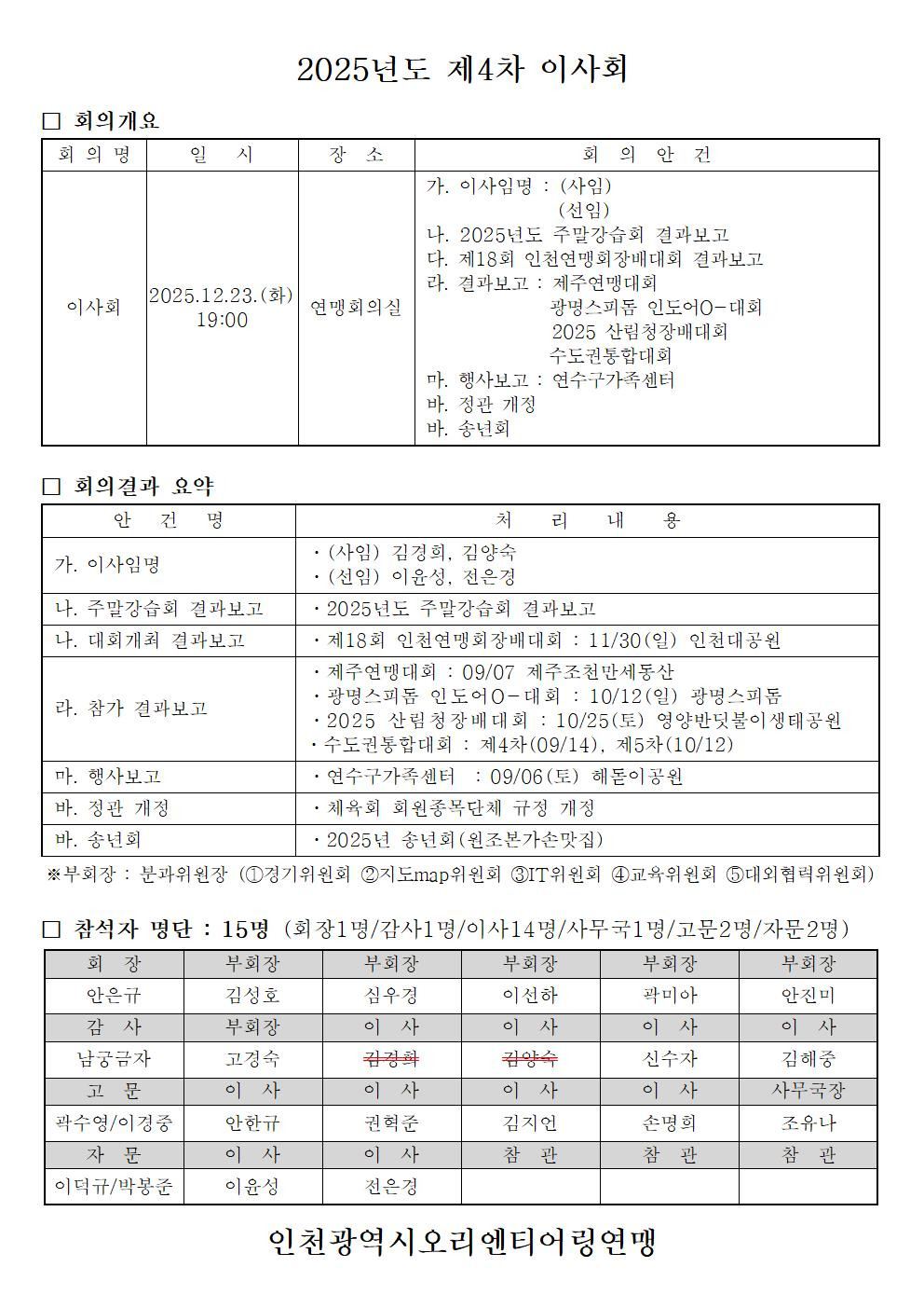 2025년도 제4차 이사회 : 2025.12.23.(화) 작성자사무국|작성시간25.12.08|조회수18 목록 댓글 0 글자크기 작게가 글자크기 크게가 다음검색 현재 게시글 추가 기능 열기 북마크 신고 센터로 신고 댓글 댓글 0 댓글쓰기 답글쓰기 댓글 리스트