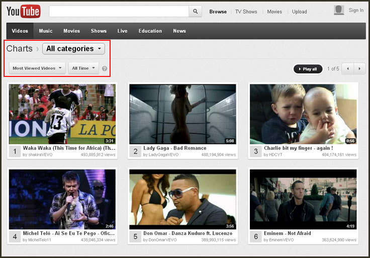 Most viewed Video 로 선택되어져 있고, 시간도 All Time 으로 되어있어 전체 조회가 가능합니다.