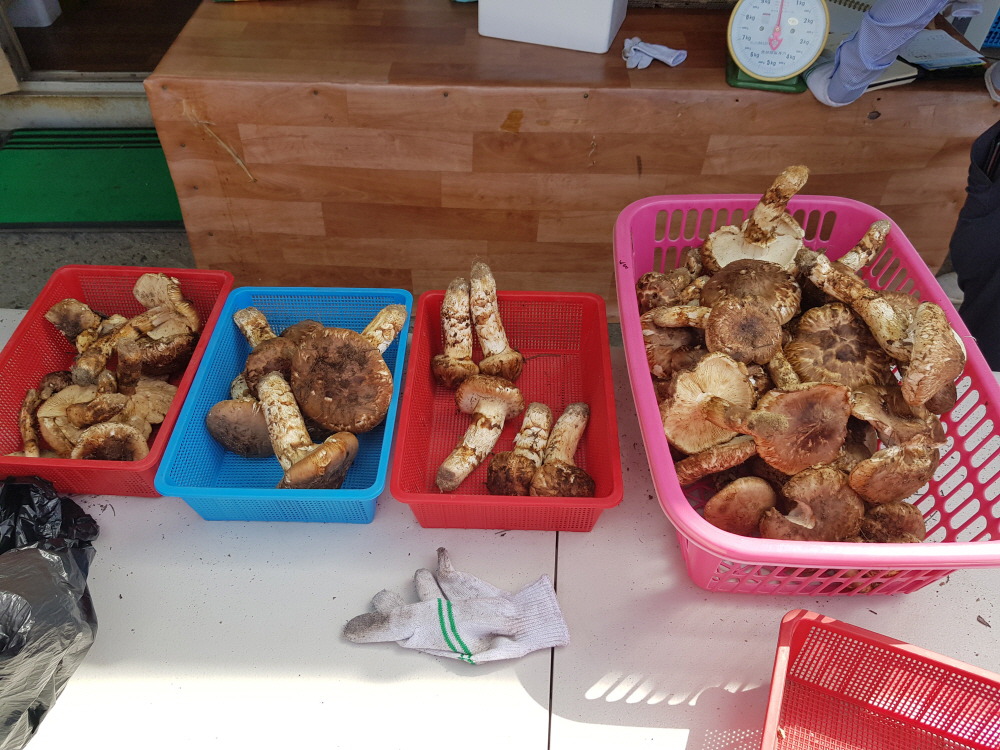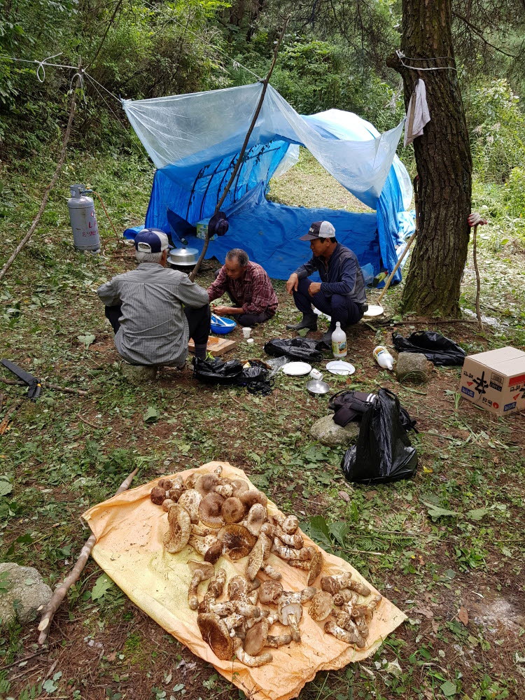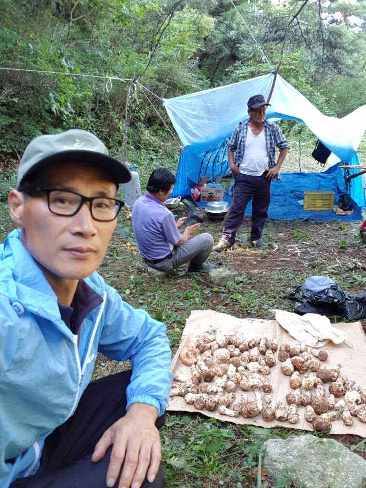 9시쯤 산을 내려와 움막에 모여서 채취한 송이를 펼쳐놓고, 판매 불가한 것들은 골라서 라면에 넣어 끓여먹고 산에서 내려온답니다.