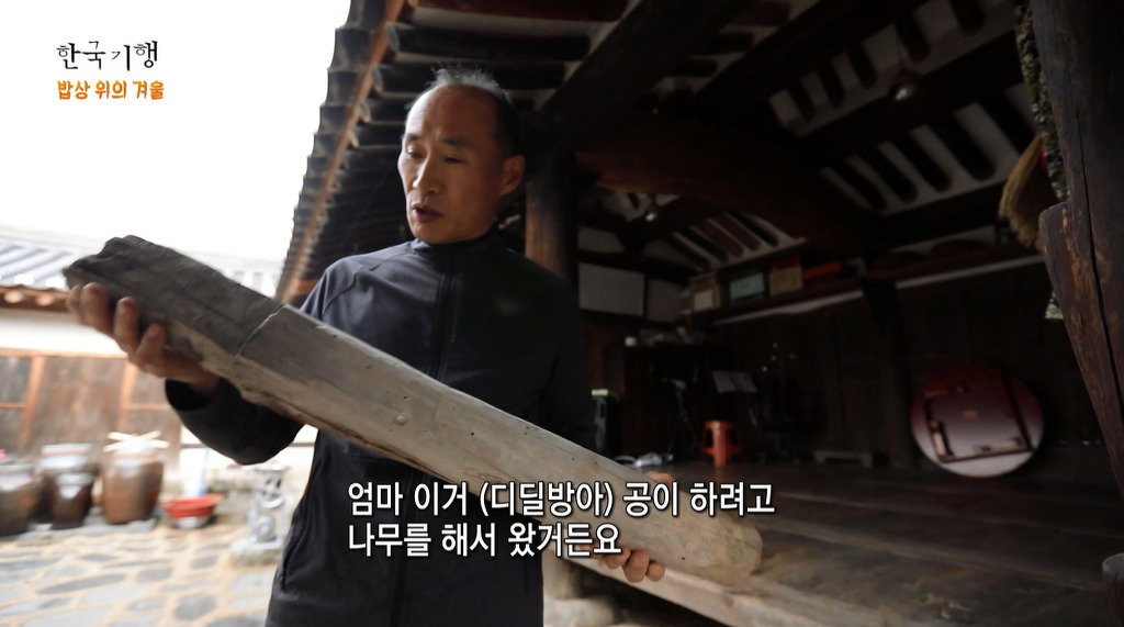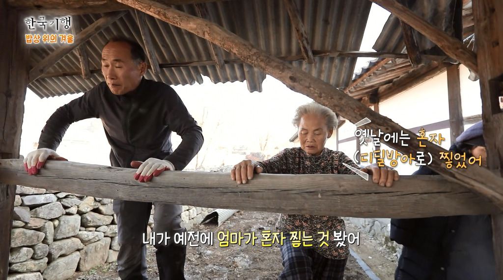 촬영소재는 산에 가서 디딜방아의 공이를 만들 목재와 땔감용 나무하기,
