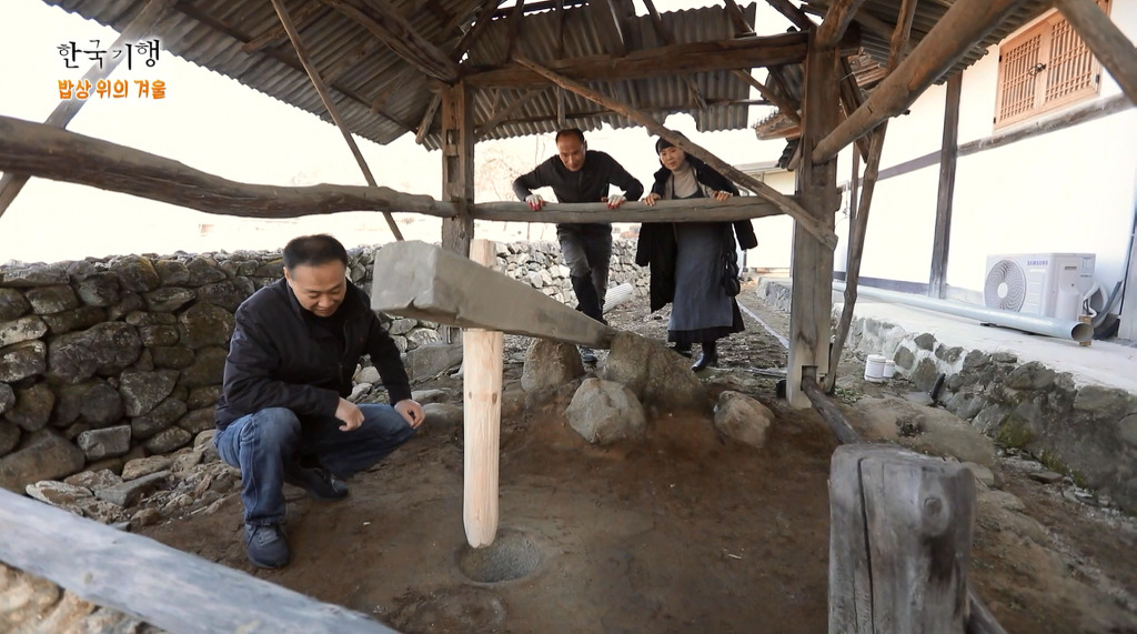 군불 넣는 전통한옥에다가 부뚜막에는 가마솥이 걸려있고 맷돌과 망가진 디딜방아까지