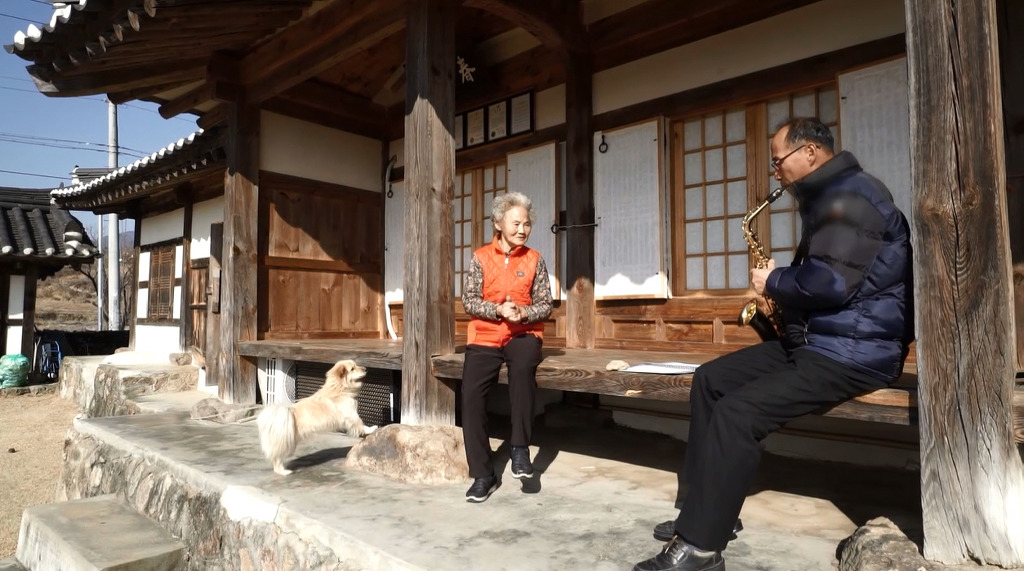 어머니와 함께 양지바른 툇마루에 걸터앉아