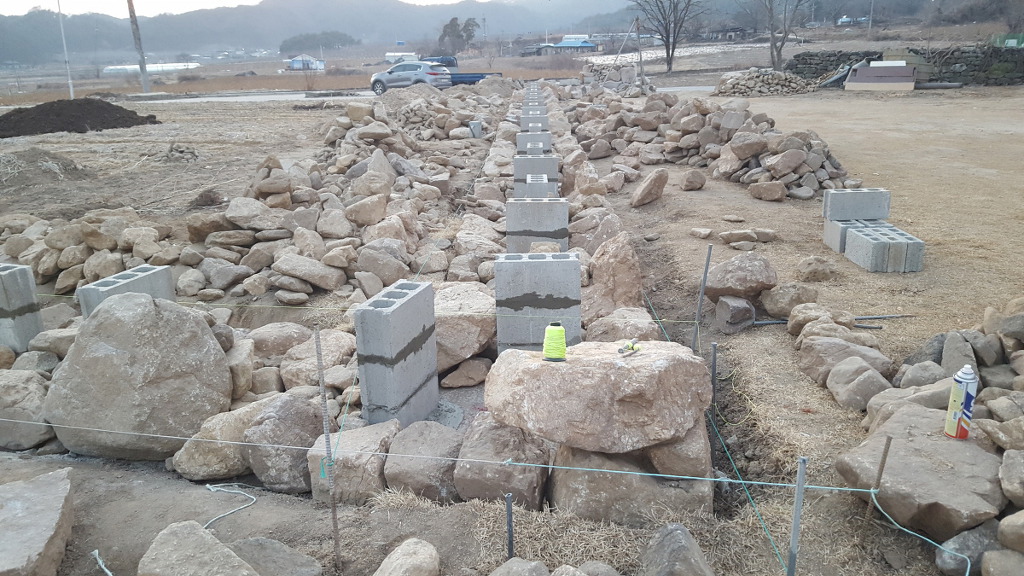 기초공사 후 돌을 쌓다가 중간 중간에 블록을 쌓는 것을 마을 어른 분들이 보시고는 어떻게 쌓을려고 이렇게 하느냐고 많이들 물어보셨지요.