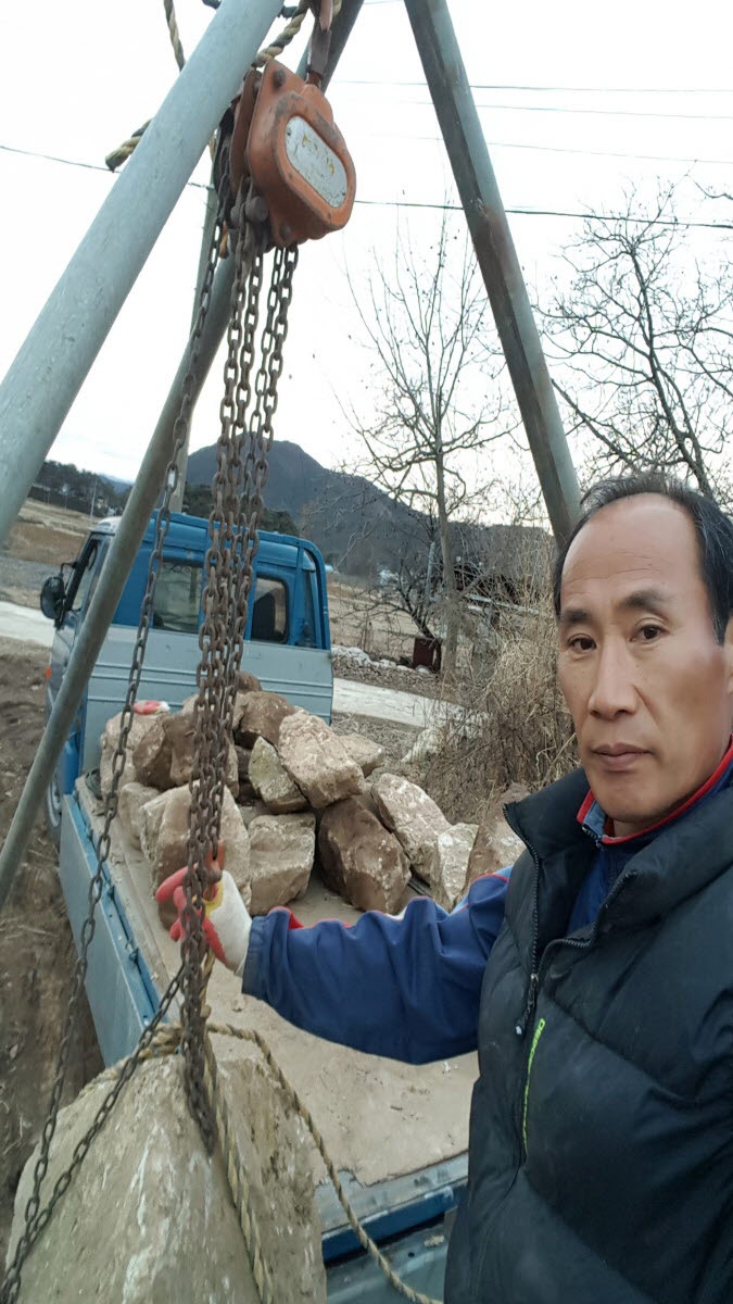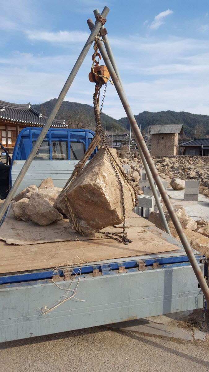 내릴 때에도 큰 돌은 이렇게 체인블록을 이용합니다