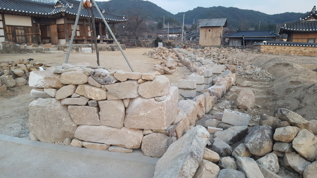 그런데 전통적인 돌담장을 쌓는다면서 중간중간에 블록을 세웠네요