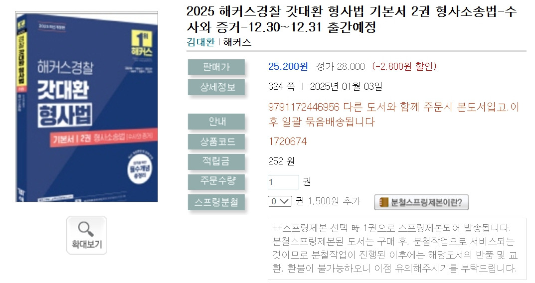[2025 해커스경찰 갓대환 형사법 기본서 2권 형사소송법(수사와 증거)]는 형사법 이론 및 판례를 체계적으로 정리한 경찰시험 형사법 수험서로, 핵심이론 정리부터 최신판례까지 한 권으로 완성할 수 있도록 구성한 기본서입니다.