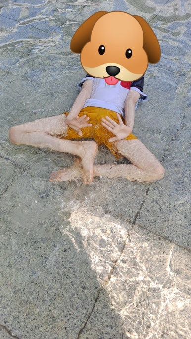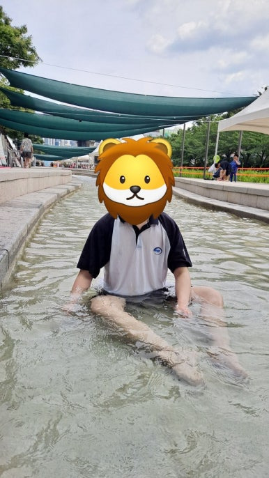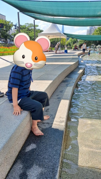 여름 한시적으로 개장한 성내천 물놀이장에서 앉아 물장구를 치며 신나게 놀았어요.