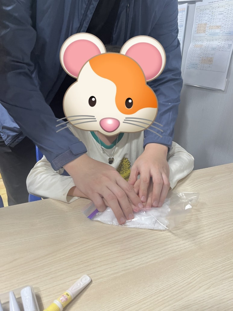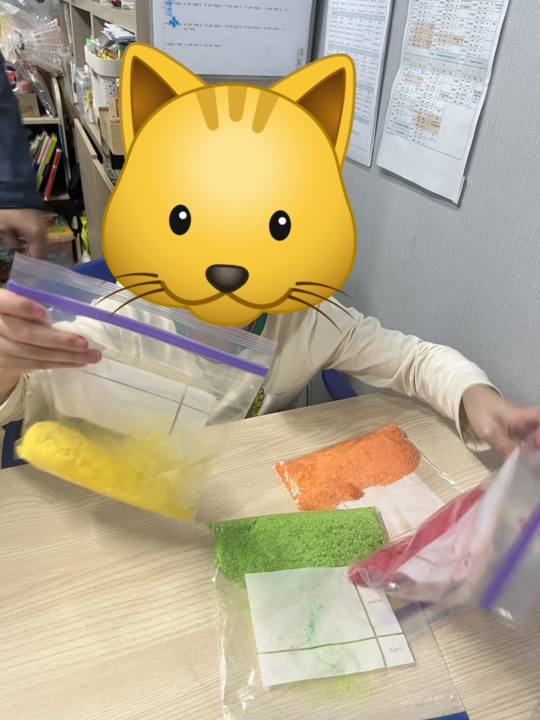 흰 꽃소금을 지퍼백에 넣고, 고른 물감을 몇 방울 떨어뜨린 뒤 손으로 비벼 색을 골고루 섞었어요. 손끝으로 전해지는 소금의 질감과 색이 퍼지는 모습을 보며 아이들은 “와~ 예뻐요!” 하며 신기해했습니다.