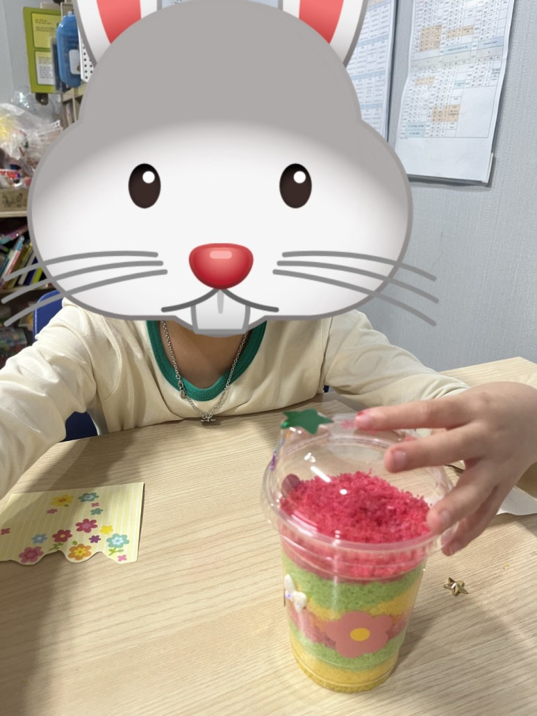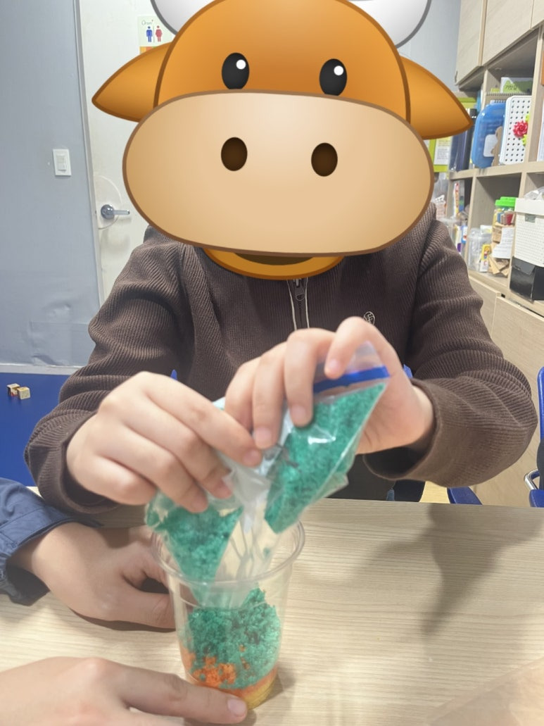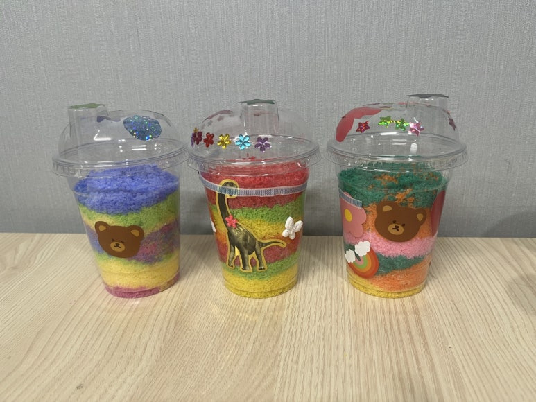 색소금이 완성되자 투명컵에 층층이 쌓기를 하며 색이 겹쳐지는 아름다운 무늬를 관찰했습니다. 마지막으로 컵을 스티커와 리본으로 꾸미기 하며 나만의 작품을 완성했어요 ✨