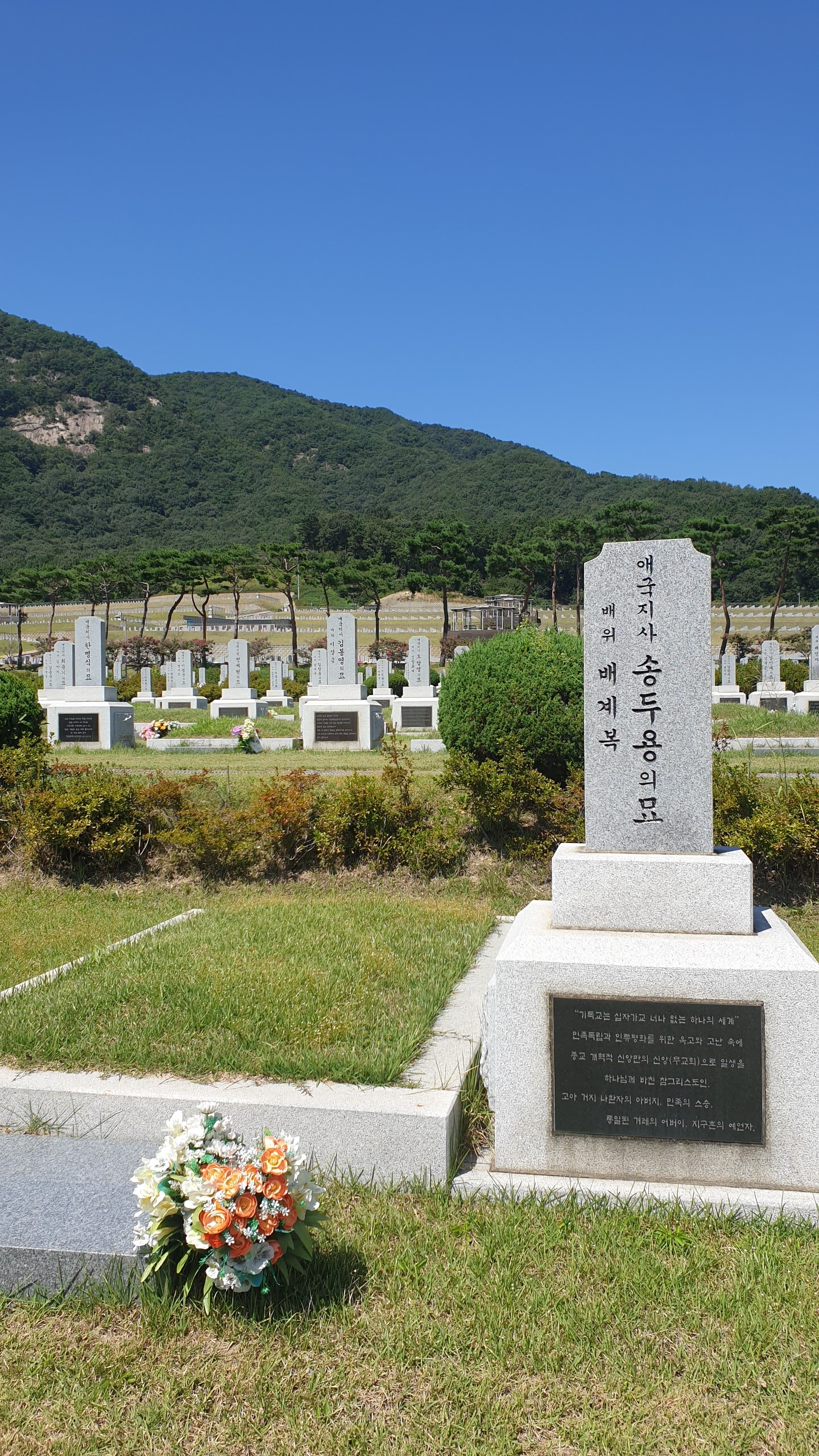 두 분은 애국지사 묘역에 계시는데, 노 선생님은 3구역, 송두용 선생님은 그 이웃 4구역 301번에 계십니다. 김포 공원묘지에는 이진구 선생님 주도로 해마다 4월이면 찾아갔었는데, 2010년 이장할 때 왔었고, 두 번째입니다. 벌써 13년이 지났네요. 하늘은 푸르고, 묘소도 깨끗하여 좋았습니다.