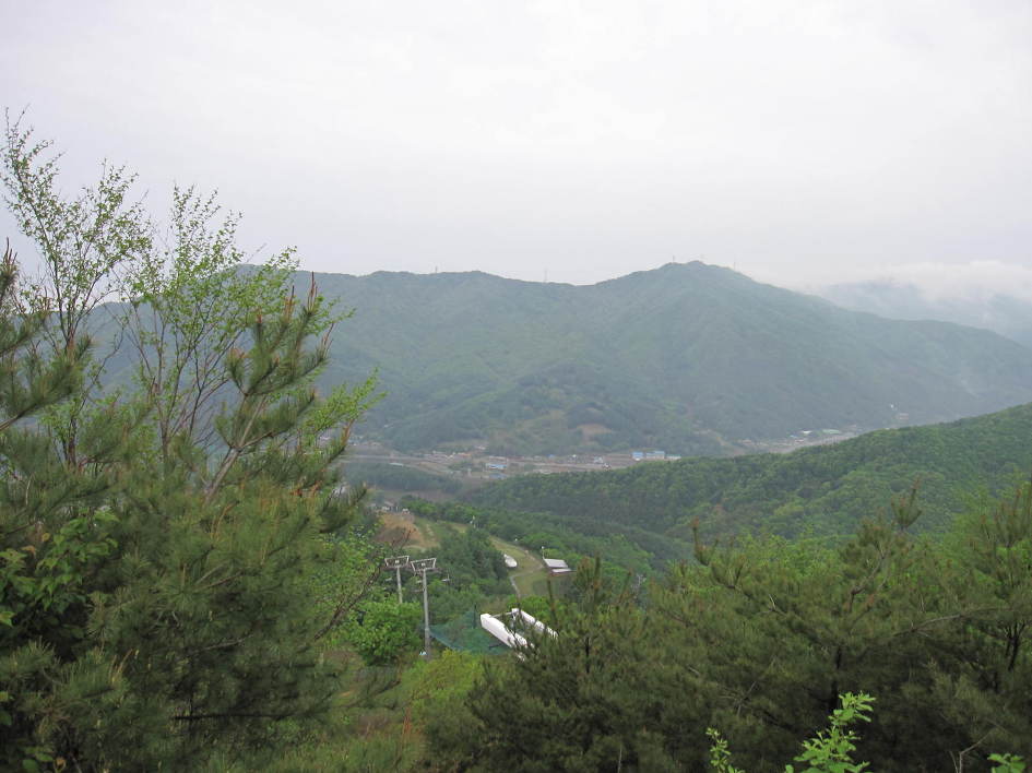 O 베어스타운 전망대에 올라서니, 정상아래로 보이는 스키장의 새삭 푸른잔디 와 내촌마을이