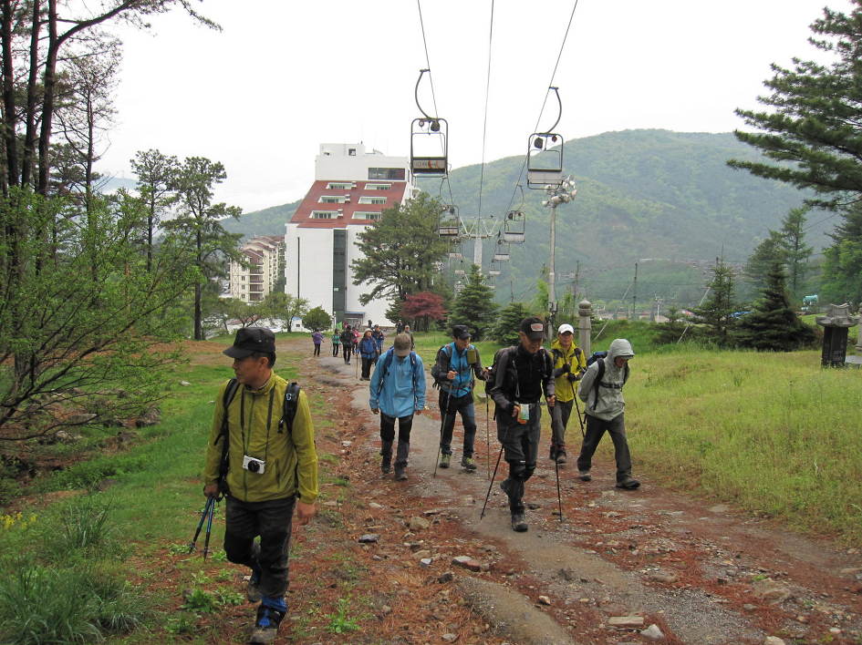 B코스 일부는 바로 밑 안부 삼거리에서 베어스 타운 리조트 주차장으로 원점 회귀 하산하고,
