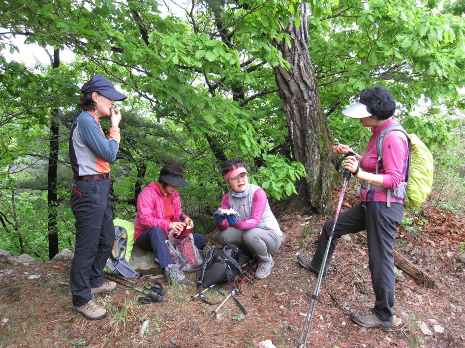 O 이곳에서 간식과 과일 등을 나눠 먹으면서 잠시 휴식(09:20-25)후 굴참나무와 소나무 숲길을