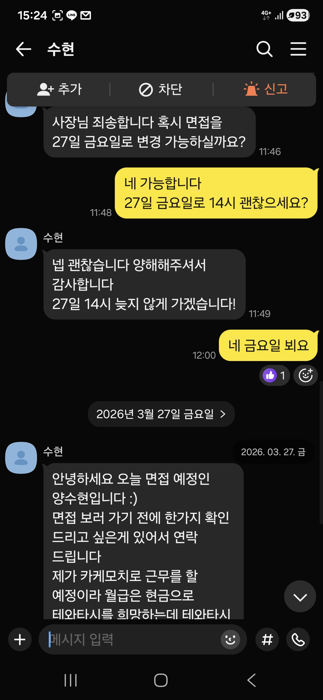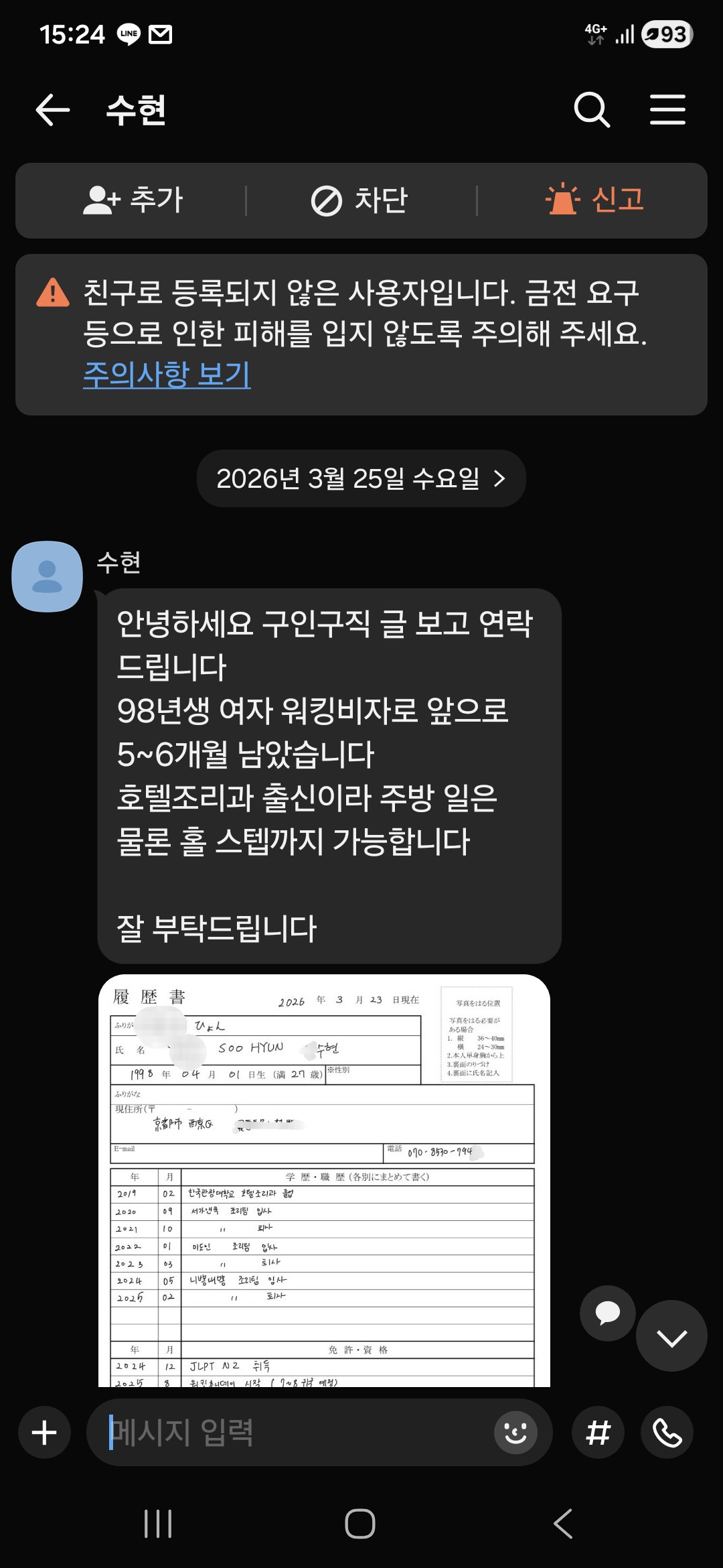 노쇼도 노쇼지만, 지원서 살짝만 지워서 다수가 볼수있는곳에 올리는 당신도 정상은 아닌거같네요 츠루하시 나쁜남자 사장님. 95% 신원 특정 가능해보이네요. 한국사회 좁잖아요, 본인 이미지에도 좋지 않아보여요. 노쇼 옹호 절대 아닙니다. 근데 그쪽이 더 잘못한거같아요. 사업하시면서 일희일비 하지 마세요~