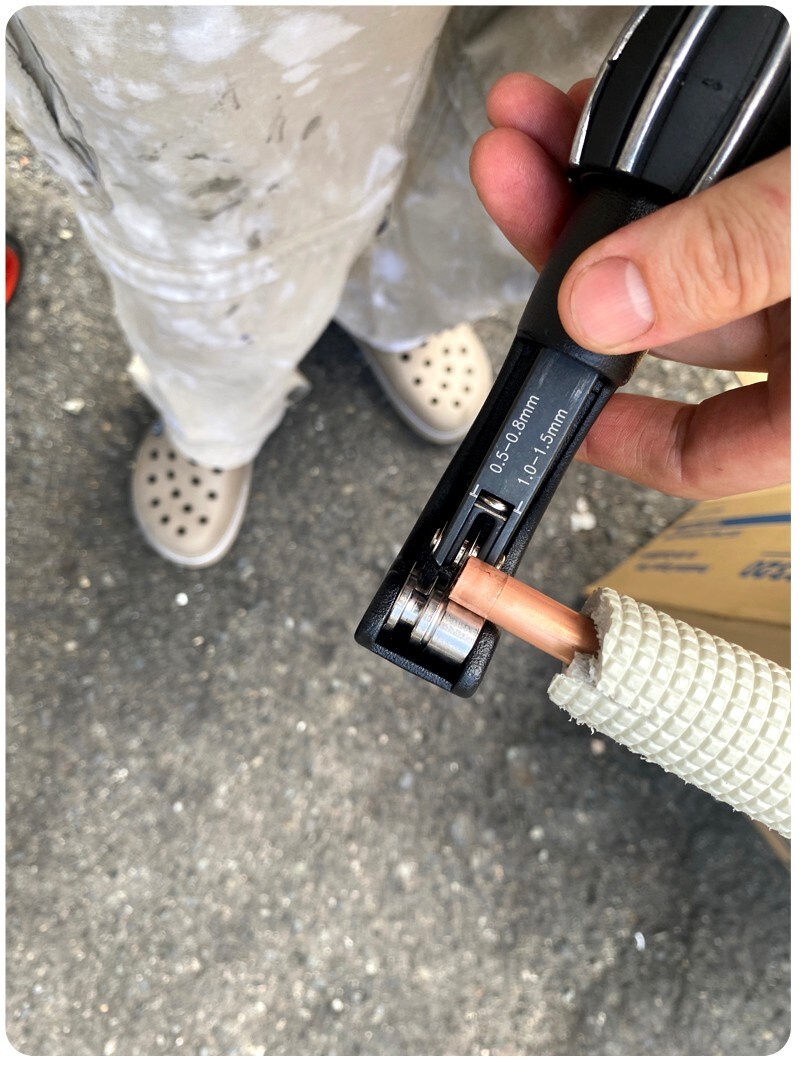 배관은 가스가 실내기로 들어 가는 저압 배관, 그리고 가스가 실내기에서 나가는 저압배관 두가지가 있습니다. 저 저날 이쁘게 확관 작업 한다고 한 8번이상을 짜르고 리이머로 깍고 확관한거 같습니다. 그리고