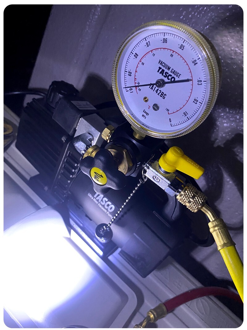 지금 보이시는게 진공 펌프고 노란 게이지가 토르게이지 라는 것입니다. 보통 매니폴트 게이지로 진공을 확인 하는데 매니폴트게이지로는 진공눈금이 너무 작아서 보이지가 않습니다. 그래서 저는 만엔 더 주고 토르게이지를 샀습니다. 장비에는 돈을 아끼지 않습니다 저는 지금 보시면 게이지가 1에 가깝습니다. 한 10분 정도 계속 빨아 주고 펌프를 끕니다. 그리고 그 10분 동안 게이지를 계속 봅니다. 눈금이 조금? 이라도 움직이면 안됩니다!! 움직이면 어딘가에서 가스가 새고 있다는 겁니다. 이게 매니폴트게이지로는 잘 안보입니다. 이거 확일 할라고 만엔 더 주고 토르게이지를 산겁니다. 가스 새나 안새나 확인 할라고요