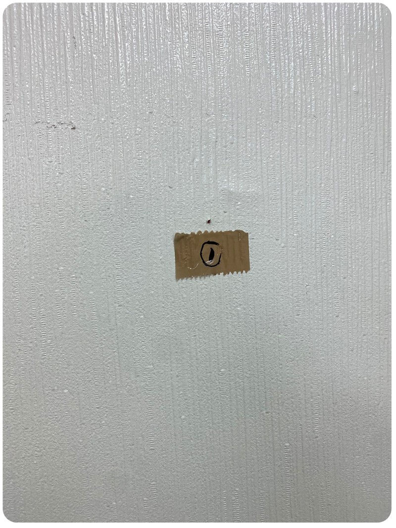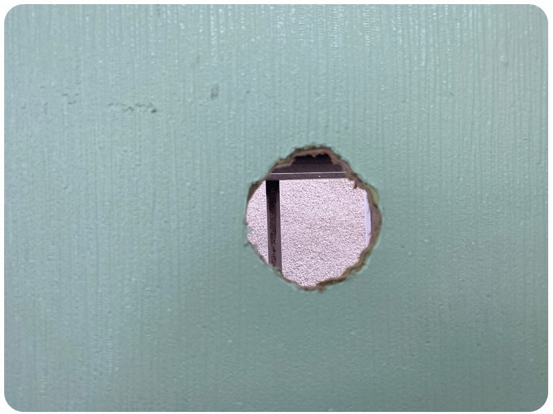 구멍을 뚫은 다음 반대편에서 잘 보이게 사진을 찍어 확인을 합니다. 구멍을 뚫고 와이프한테 큰소리로 뚫렸어!!? 라고 하니까 대답이 없어요. 안들리나...;; 그래서 더 큰소리로