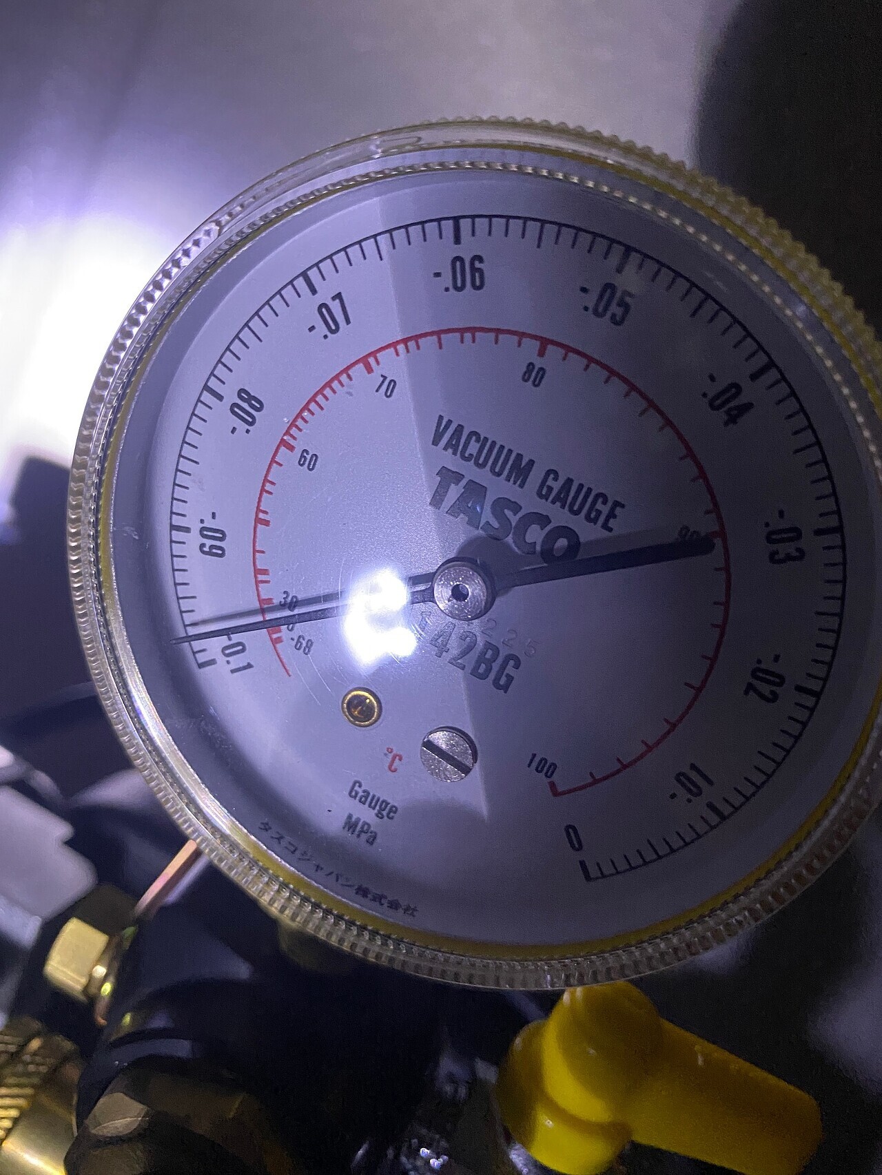 정확히 10분후 눈금확인 결과 조금도!! 안움직였습니다!! 확실하게 확관작업을 하고 배관을 이을때 싸구려 몽키로 안조이고 그 비싼 토크렌치 사다가 조여서 입니다. 이렇게 장비에 돈을 쓰면 완벽하게 작업이 가능 합니다. 장비사는데.. 한 10만엔 이상은 쓴거 같습니다... 그리고 여기서 끝이 아니고 게이지를 보시면 1에 가깝지만 1이 아니므로 관에 공기가 조금 남아 있습니다. 그러니 에어퍼지를 해서 그 남아 있는 공기도 빼내야 합니다. 에어퍼지는 고압쪽 밸브를 다!~ 열고 저압쪽 배관 커플링을 살짝 열면 가스가 공기를 밖으로 밀어 냅니다 하얀 가스가 살짝 나오면 바로 닫아 공기를 완벽하게 뻅니다.