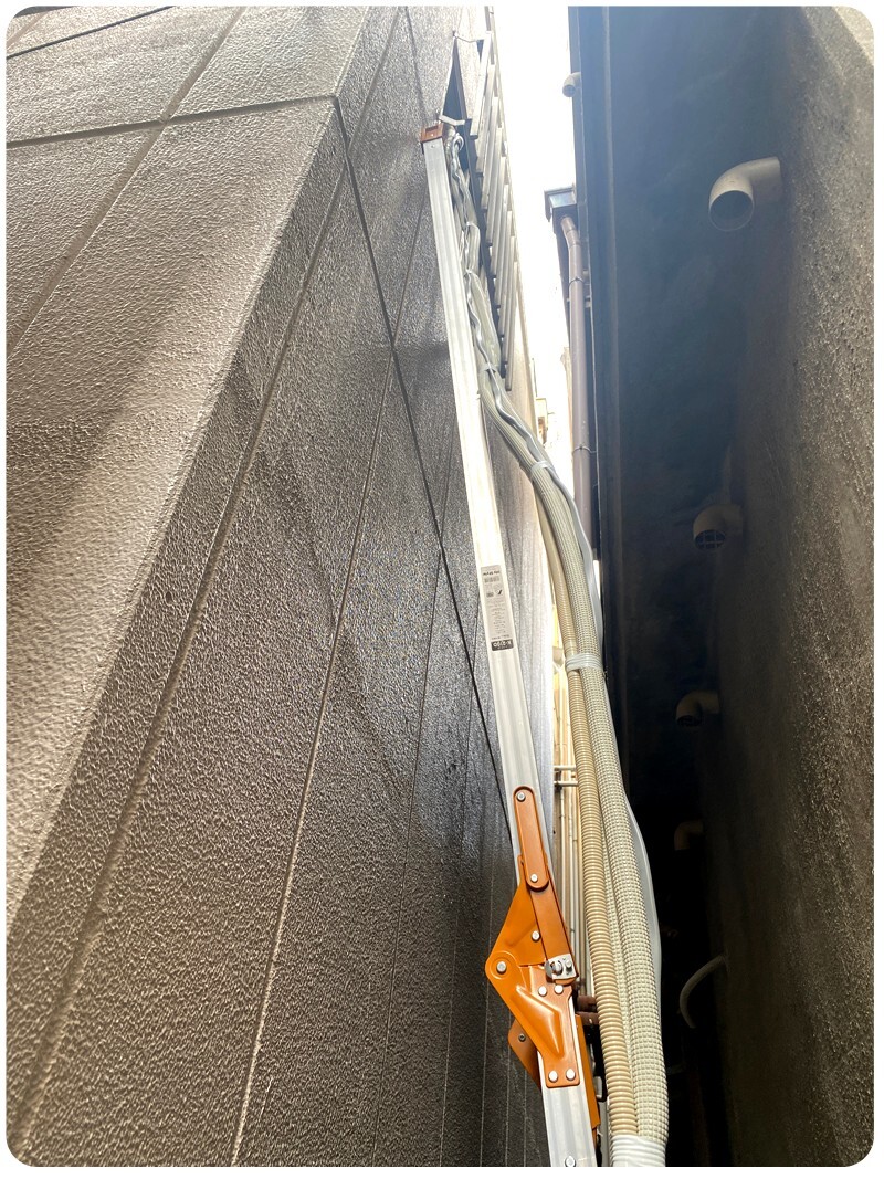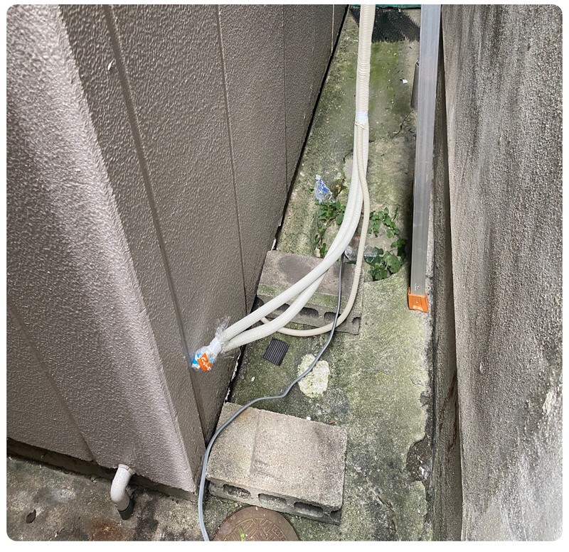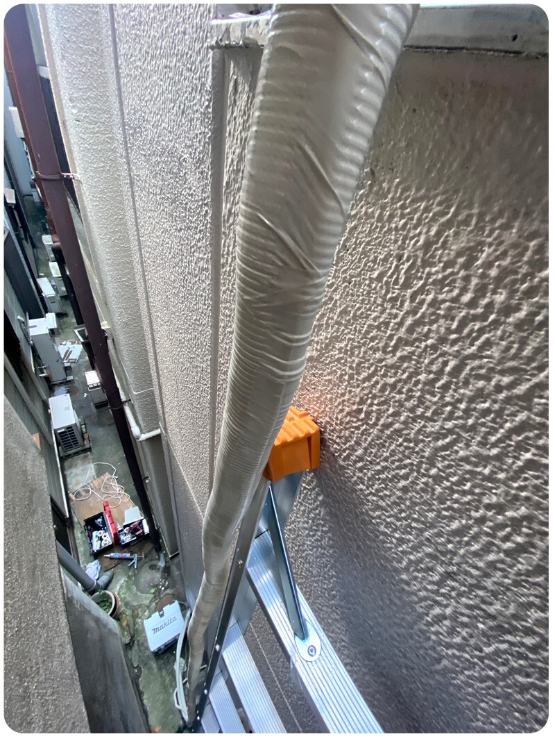 일단 뒷쪽에 가서 미리 사다리를 설치 합니다. 에어컨 실내기를 달기전 배관 구멍을 확보해 놔야 실내기를 달 위치가 잡힙니다.