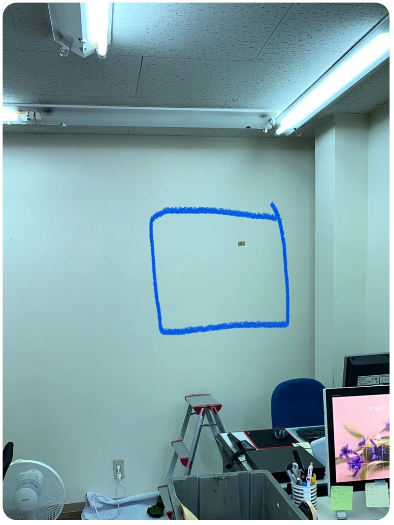 에어컨 구멍 보다 조금 윗쪽으로 해서 빨간 네모 만큼 설치해야 겠다! 라고 계산을 하고 움직여야 합니다. 그리고 동시에 나중에 에어컨에 달려 있는 배관을 뒷쪽으로 빼고 새로 사온 동관 파이프를 이을때의 작업 공간의 한계도 생각 하지 않으면 안됩니다. 거기까지 계산을 한뒤에 확정이 되면 구멍을 크게 뚫습니다.