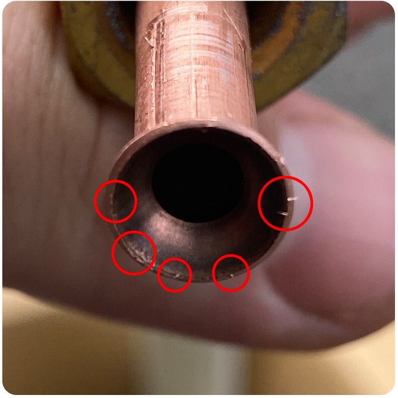 이렇게 불량이 납니다... 저대로 이으면 1년 안에 가스 다 샙니다... 나중에 진공 작업하면 다 티나요... 그러니 과감하게 짤라 버리고 다시 작업 해야 합니다.