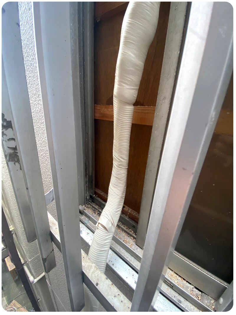 이렇게 되어 있습니다. 이제 저기 판자에 구멍을 뚫어 에어컨 배관을 뺄껍니다. 처음부터 구멍을 크게 뚫으면 안됩니다. 처음에는 진짜 모기 X구멍 만하게 뚫은 다음 반대편에서 보고 어느정도 위치에 에어컨이 설치가 될련지 확인을 하고 뚫어야 합니다. 이거 확인 안하면 나중에 진짜 X됍니다. 에어컨이 너무 높거나 낮게 설치가 됩니다.