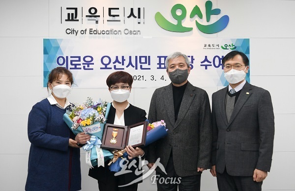 오산시는 소중한 생명을 구한 요양보호사 박영희씨(사진 왼쪽 두번째)에게 '의로운 시민' 표창패를 수여했다. © 오산인포커스