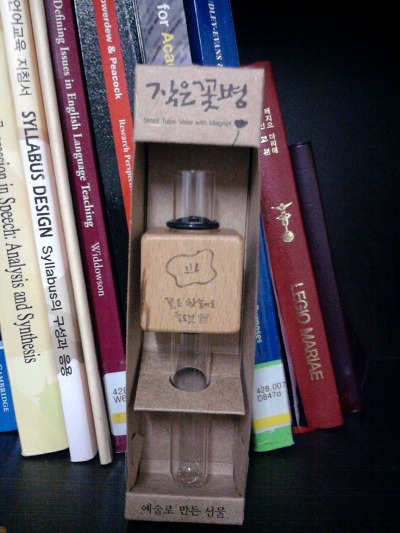 이름이 작은 꽃병인데, 정말 작아요. 뒤에 꽂혀있는 책들도 작은데 그것 보다 더 작아요. 이 안에 씨앗을 넣고 키우는 거라는데, 물 안 주고 신경 안써도 잘 큰다는 선인장도 제 손에서 살아남지 못했던 기억이 떠오르더군요. 겁나서 아직 같이 들어있는 씨앗은 건드리지도 못했어요. 어쩜 제가 못하고 두려워하는 걸 "딱" 골라 주시다니.