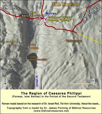 이스라엘의 최북단 헤르몬 산의 발치에 자리잡고 있는 가이사랴 빌립보는 구약 성경에서는 언급된 바 없으며, 헤롯 대왕이 BC 20년 로마 황제 아우구스도 (Augustus)로부터 선물로 얻은 도시로, 희랍시대에는 판 (Pan) 신전이 있었다. 헤롯 대왕이 죽은 후 그의 아들 헤롯 빌립이 이곳을 자기의 수도로 정하면서 로마의 황제 이름과 자신의 이름을 더한 가이사랴 빌립보라 칭하였다. 헤르몬 산으로부터 흘러내려오는 풍부한 물 (초당 20 ㎥)이 이 도시를 적셔줄 뿐만 아니라 요단강을 통하여 갈릴리 호수로 모이게 된다.