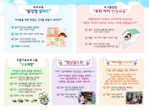 [6월] 부모교육, 소그룹상담, 주말가족프로그램, 장난감소족, 아이맘나누리 작성자아이맘카페1호점|작성시간15.05.12|조회수595 목록 댓글 0 글자크기 작게가 글자크기 크게가 다음검색 현재 게시글 추가 기능 열기 북마크 신고 센터로 신고 댓글 댓글 0 댓글쓰기 답글쓰기 댓글 리스트
