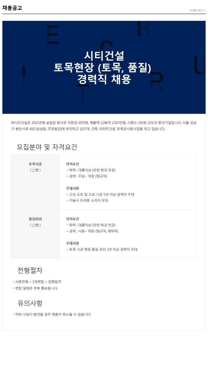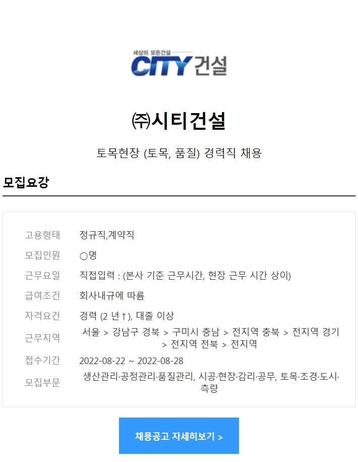 [(주)시티건설] 토목현장 품질관리직, 토목시공직 채용 작성자취업멘토|작성시간22.08.23|조회수147 목록 댓글 0 글자크기 작게가 글자크기 크게가 [(주)시티건설] 토목현장 품질관리직, 토목시공직 채용 채용공고 바로가기 >>http://joburl.kr/UvTzQ시티건설 채용 - 토목현장 (토목, 품질) 경력직 채용 | 잡코리아경력 : 경력2년이상, 학력 : 대졸이상, 급여 : 회사내규에 따름, 마감일 : 2022.08.28www.jobkorea.co.kr (자료제공 : 잡코리아) 다음검색 현재 게시글 추가 기능 열기 북마크 공유하기 신고 센터로 신고 댓글 댓글 0 댓글쓰기 답글쓰기 댓글 리스트
