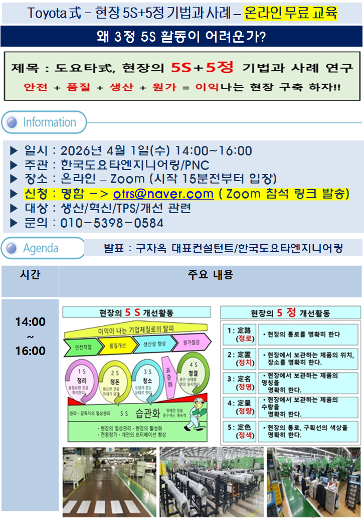 Toyota 式 - 현장의 3정 5S 기법과 사례(4/1) 작성자P N C|작성시간26.03.31|조회수28 목록 댓글 0 글자크기 작게가 글자크기 크게가 다음검색 현재 게시글 추가 기능 열기 북마크 공유하기 신고 센터로 신고 댓글 댓글 0 댓글쓰기 답글쓰기 댓글 리스트