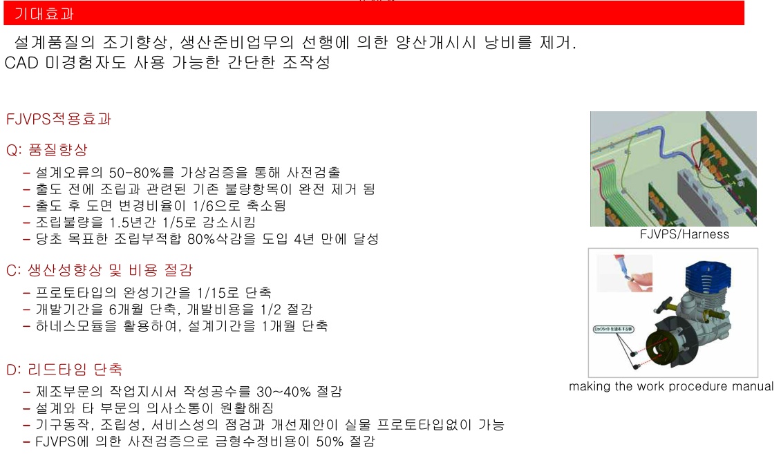 1. 설계 초기 단계부터 제조 부분의 검토가 가능하여, 시작품을 만들지 않고 조립 시 문제점을 빠르게 파악, 설계 부문에 피드백, 제조 파트 의견 반영이 가능합니다. 제품 개발 프로세스의 최적화로 설계~생산 시간 단축.