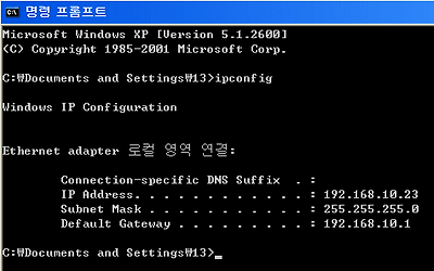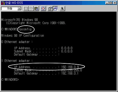 2. '한글 MS-DOS' 창에 'ipconfig' 라고 입력한 후 엔터키를 누른다. (단 커서가 나타난 앞의 위치가 C:WINDOWS 또는 C: 인지 확인한다.) 3. 결과 화면에서 위의 그림처럼 'IP Address' 부분을 참고한다.