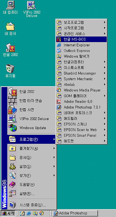 1. 윈도우 시작단추를 눌러 프로그램메뉴 아래 있는 '한글 MS-DOS'를 실행시킨다.