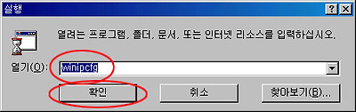 ※ Windows98,me 쓰는분은 winipcfg 입력!! ※ Windows2000 쓰는분은 ipconfig 입력!! ※ WindowsXP 쓰는분은 cmd /k ipconfig 입력!! |