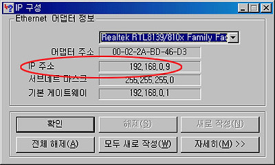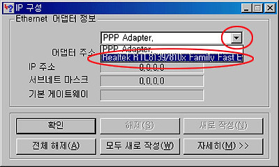 ![]() 2. IP구성 상자에서 목록단추(세모 모양단추)를 눌러 'PPP Adapter'가 아닌 아래의 다른것(랜카드명-각 컴퓨터에 설치되어 있는 종류에 따라 저와는 이름이 다를 수 있습니다.)을 선택한다.
