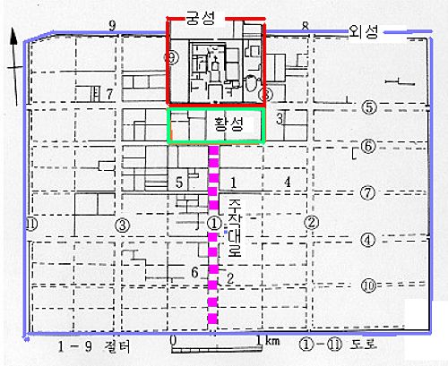 상경용천부는 격자형의 도로체계를 갖고 있으며, 동서남북이 통하도록 직선으로 큰 가로를 만들고, 외성을 따라 순환로를 만들었다. 이러한 특징은 당나라의 장안성과 유사해 장안성의 영향을 받은 것으로 보고있다.