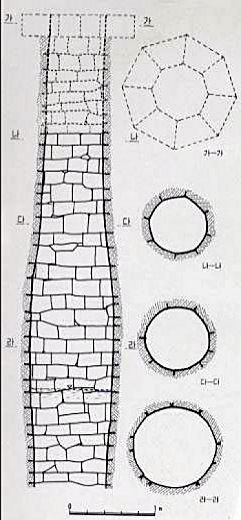 ▲우물은 지상에서 깊이 2m까지 직경 약 0.66m의 8각형 단면을 이루고 내려갔으며, 그 아래로는 단면이 원형으로 변하면서 넓어지기 시작하여 깊이 4m되는 곳에서 직경이 최대 0.99m로 되었다. 그 아래로는 좁아지면서 우물 바닥에 이르러 그 직경은 0.82m로 되었다. 우물의 지금 깊이는 약 5.6m이다. 우물 벽의 곡선은 우물 벽의 자기 무게와 지압에 잘 견디어내는 역학적 곡선이다. 이 우물은 내부의 형태적 미에도 깊은 주의를 돌렸다.