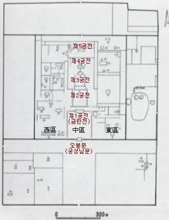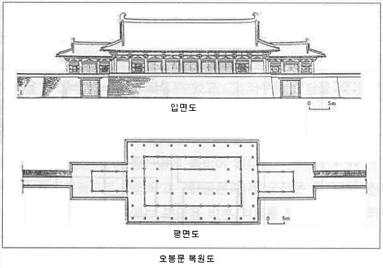 궁성의 남문은 높이 4-5m의 축대 위에 세웠다. '영안현지'에서 '오봉루'라 한 것이다. 축대 앞의 3개 큰 돌계단이 그 옛 모습을 더듬게 한다. 남문에는 양쪽에 곁문이 달렸다. 북문은 북쪽 성벽 중앙에 위치하며, 동문은 정원터로 통할 수 있게 동쪽 성벽 남쪽에 냈다. 서문도 있었을 것으로 보인다.