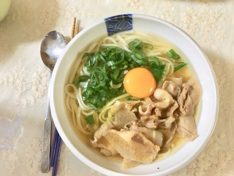 우동 국물에 면 넣고 파송송송, 고기 올리고