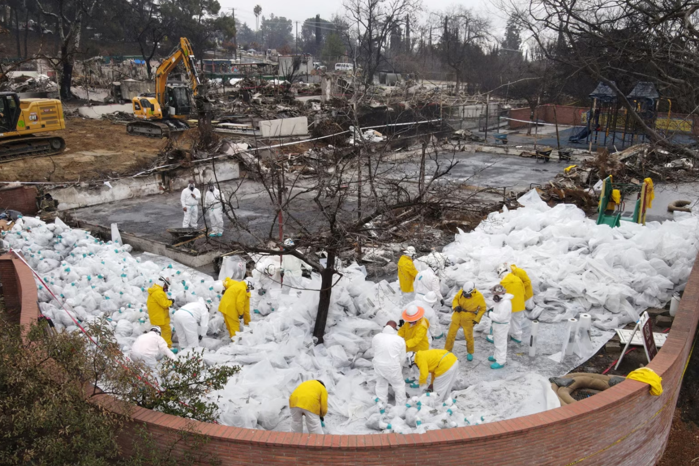 A drone view shows workers in protective suits collecting burnt asbestos from the Eaton fire at a destroyed school, Loma Alta Elementary School in Altadena, California, Feb. 5, 2025.
