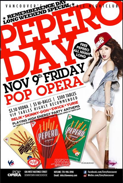 ★ PEPERO DAY ★ You love to eat Pocky Chocolate?! Love the after taste of chocolate with liquor?! or just wanna have some sweet stuff for the night?! Come down to Pop Opera 'Pepero Day' event on FUSION FRIDAYS long weekend! ★ GIRL POWER BEFORE 11PM ★ 1) Welcome Cocktail ( Vodka/Soho/Cranberry/ 2) Instant VIP Access bypassing the line up 3) Complementary Coat Check (1 Item) ★ WEEKLY FEATURES ★ 1) $3.5 Vodka l $5 Highballs l $300 Tables 2) Extended Hours Open Until 3AM! 3) Available Parking Lot Around The Corner ★ ALL STAR DJ LINE UP ★ DJ Relik + DJ Swick + DJ Skinny-Doh + DJ Yurie [ Playing The Best HIGH ENERGY Party Anthems ] ★ VIP PACKAGES ★ Ultimate V.I.P. Table Package ( $300 ) 1 Smirnoff Vodka +Mixers +6 VIP Admission +VIP Booth Ultimate BIRTHDAY Package ( $450 ) 1 Smirnoff Vodka +Mixers +10 VIP Admission +1 Champagne +VIP Booth |