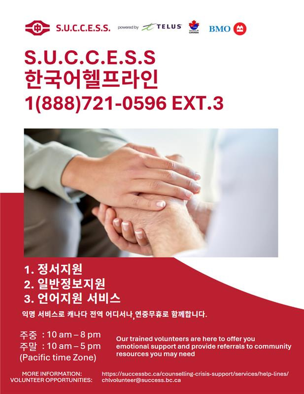 밴쿠버 NGO 석세스에서는 이민자들을 위한 헬프라인을 운영중입니다.